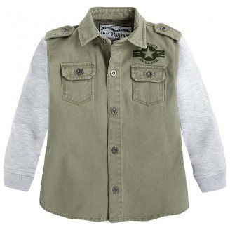 Цвет - хаки. Рукава из однотонного трикотажного полотна серого цвета. На груди кармашки с клапанами на пуговицах. На рукавах трикотажные манжеты, на плечах - погончики